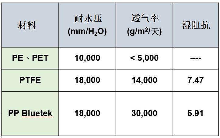 - 第五代:Bluetek PP多孔防水透气薄膜。由以西公司创办人林俊诚博士所开发。此膜在以下6方面更胜EPTFE膜: